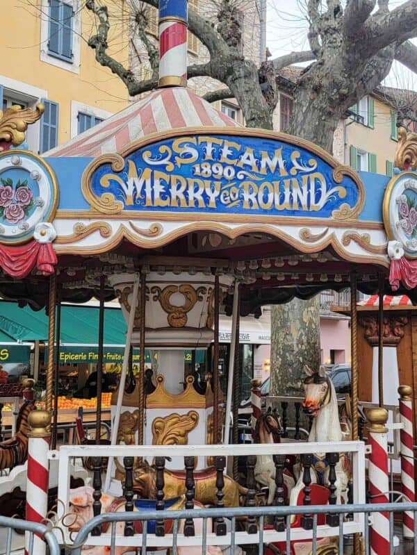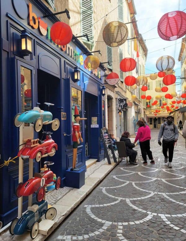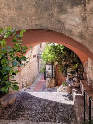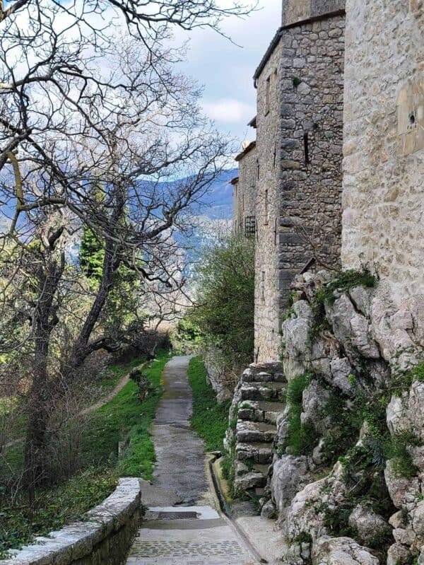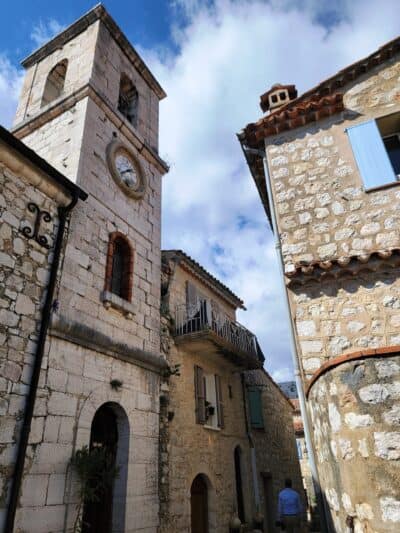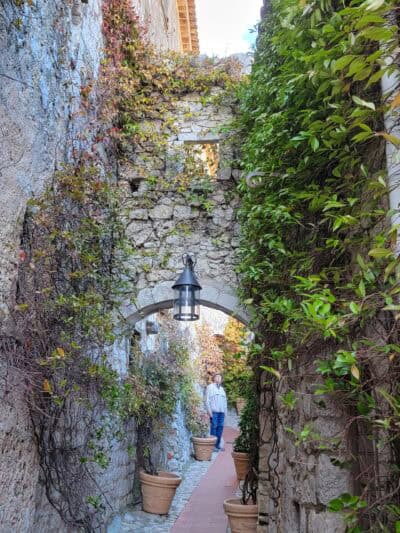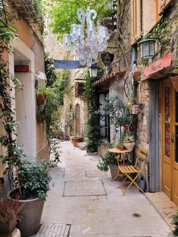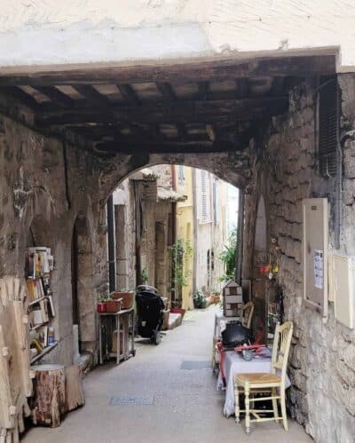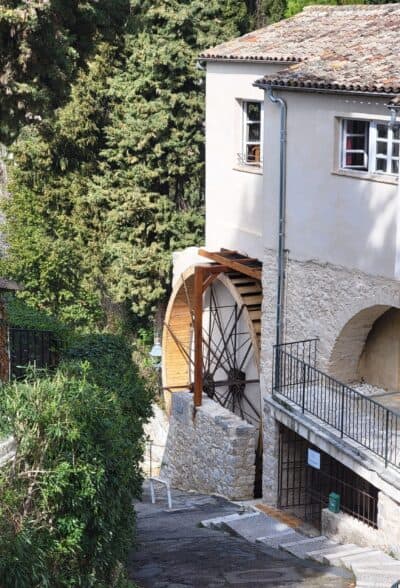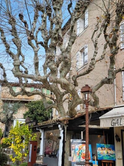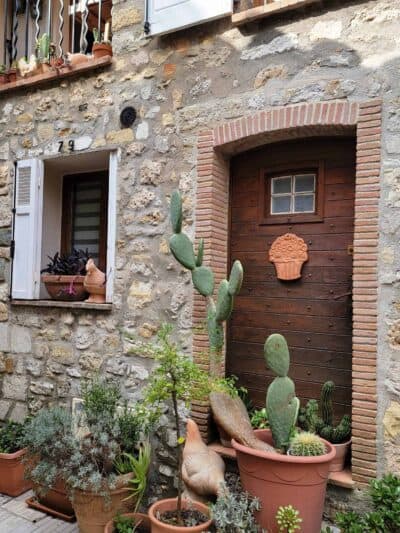We enjoyed wandering the well-preserved old town ("Vieux Village"), which is arranged in a circular, spiral formation, featuring narrow cobblestone streets with restored stone houses. These houses were built in the Middle Ages, around the 11th century. In several places, we saw large Plane Trees growing through roofs of restaurants and shops!