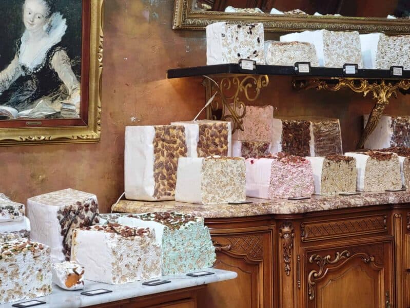 We couldn't help but stop at one of several nougat stores, "Le Chaudron D'Oscar", since my husband is a huge fan! Nougat is a chewy (or sometimes brittle) confection made by whipping egg whites into boiled honey or sugar syrup. The store had a multitude of colors and flavors, and I must say that the pistachio-almond we picked was delish.