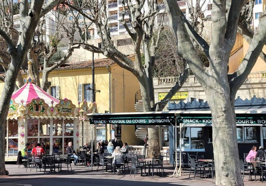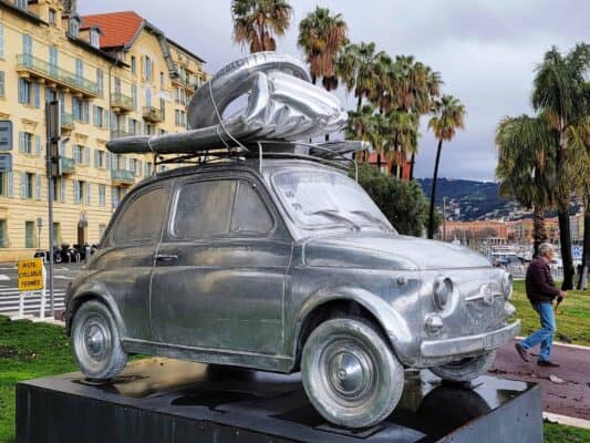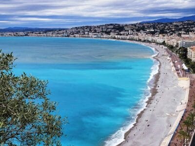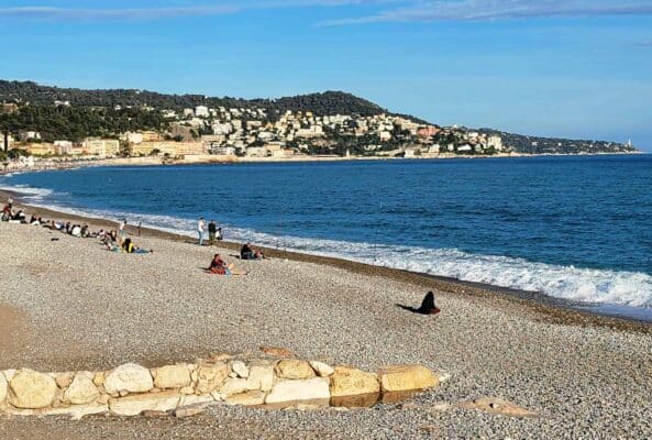 Along the beach is a famous 7-kilometer (4.35-mile) long coastal boulevard ("Promenade des Anglais"), which is lined with palm trees and blue chairs inviting both tourists and locals to take a moment to sit and enjoy the sea air.