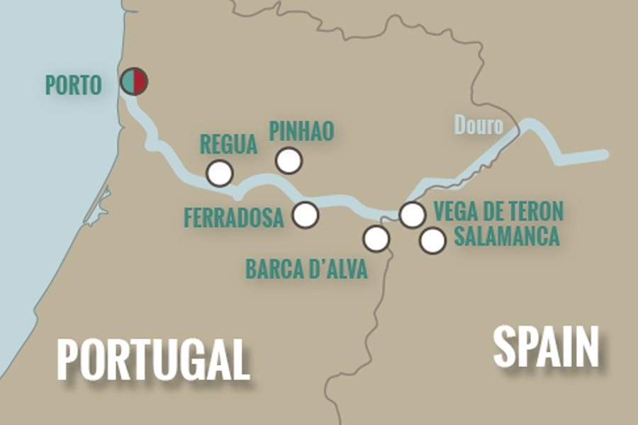 The Douro Valley is the birthplace of Port Wine, and is the only place in the world that can legally produce it. The Douro River flows westward through the valley from its origins in north-central Spain, then cuts across northern Portugal all the way to the coast, where it empties into the Atlantic Ocean at Porto. The Douro is the third largest river in the Iberian Peninsula, with steep and picturesque riverbanks covered with terraced vineyards and small villages.