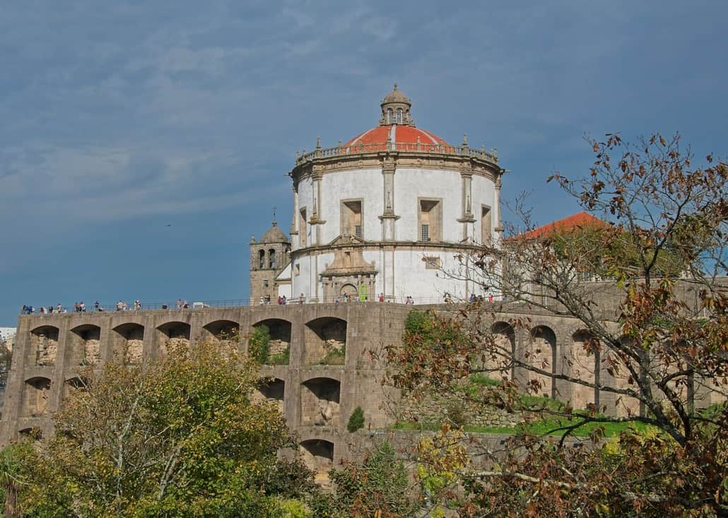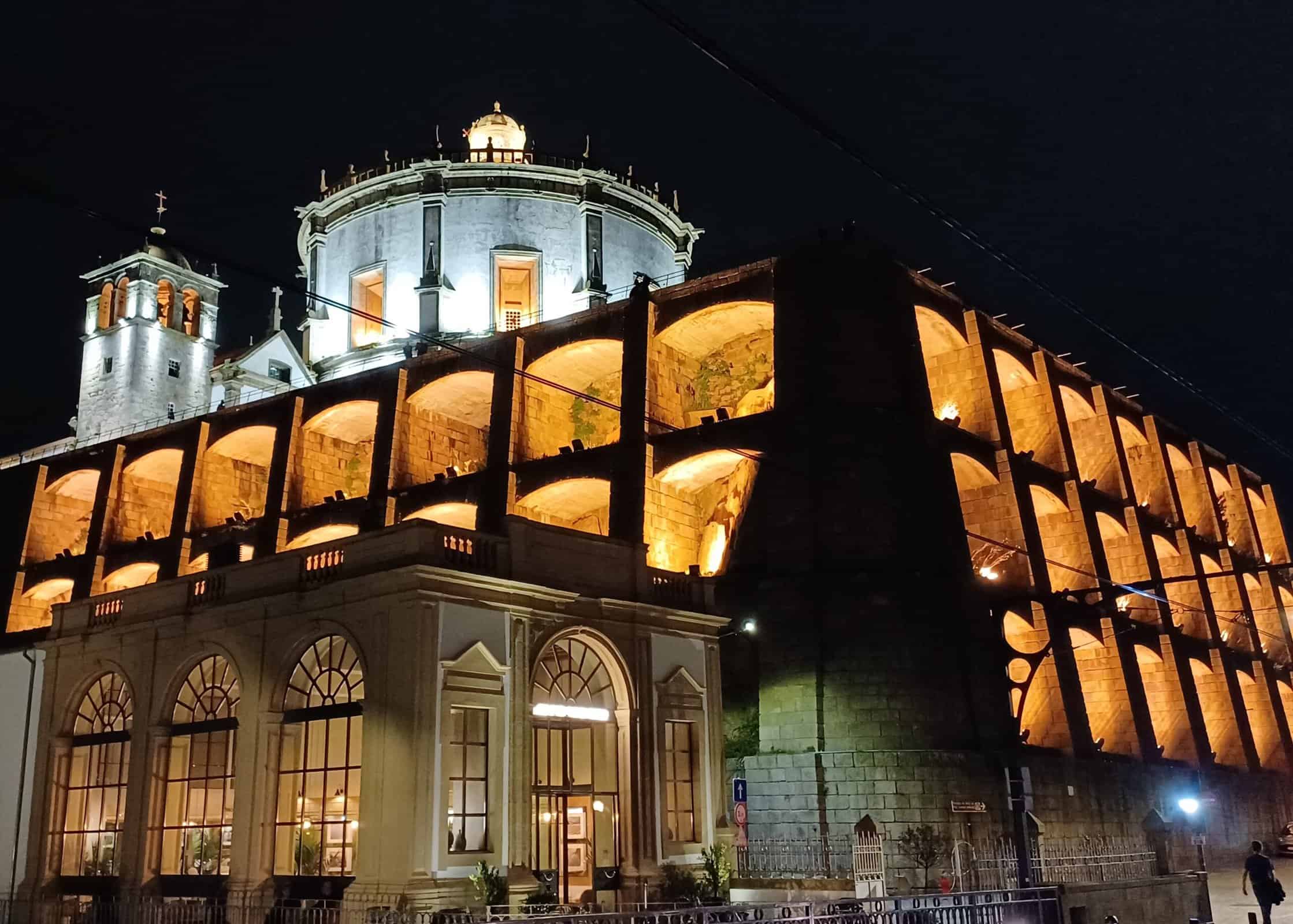 The day and night photos to the left and right are of a former monastery in Vila Nova de Gaia, situated on an outcrop overlooking the Dom Luís I Bridge and the historic center of Porto.