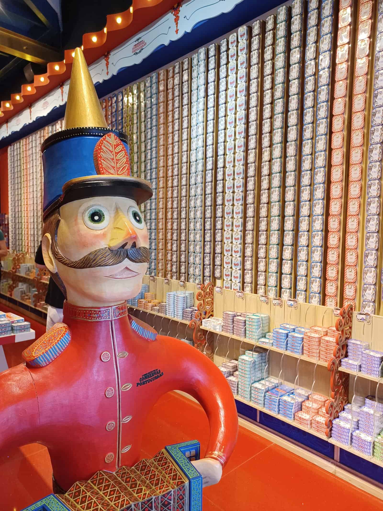 Sardine shops like this one can be found in many towns in Portugal, each one elaborately decorated in a unique theme. This is "The Fantastic World of the Portuguese Can" shop in Vila Nova de Gaia, and the vibrant interior makes you feel like you're in a circus! What you see on the wall are cans of sardines stacked from floor to ceiling (click photo to enlarge). They are colorfully decorated with vibrant patterns, designs that celebrate the city and its culture, cans for each year since 1916 along with an important event that happened that year, and much more.