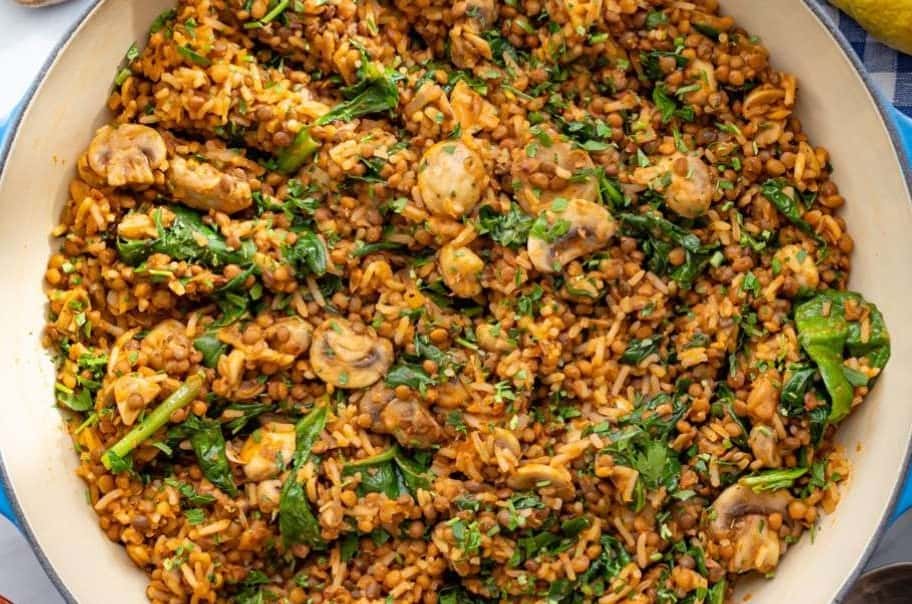 This is a delicious and healthy one-pot Mediterranean style meal, loaded with mushrooms, lentils and spinach, then tossed with rice. You won't go hungry!